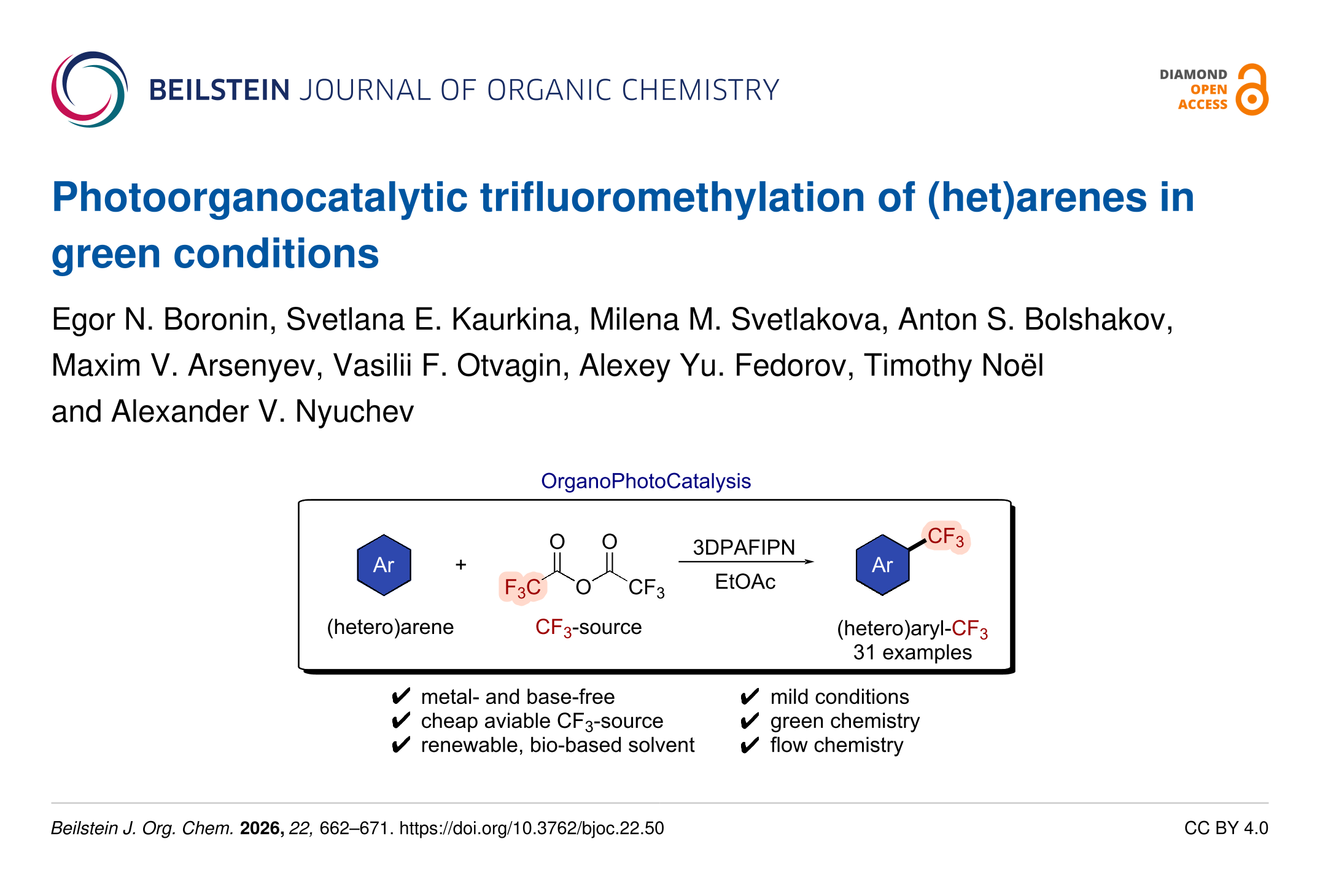 Boronin, E. N.; Kaurkina, S. E.; Svetlakova, M. M.; Bolshakov, A. S.; Arsenyev, M. V.; Otvagin, V. F.; Fedorov, A. Y.; Noël, T.; Nyuchev, A. V. Beilstein J. Org. Chem. 2026, 22, 662–671. doi:10.3762/bjoc.22.50