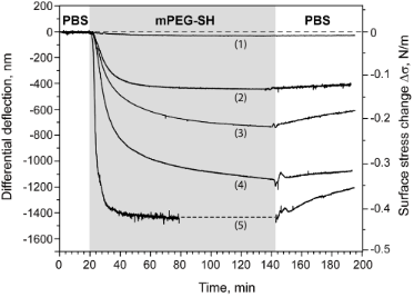 Figure 3: Concentration-dependent grafting of mPEG–SH on Au: overlay view of five binding curves. The grey area indicates the period of injection of mPEG–SH solution. The binding curves were obtained at mPEG–SH concentrations of 0.5 μM (1), 10 μM (2), 50 μM (3), 100 μM (4) and 500 μM (5). Each curve was obtained by subtracting the response of the reference cantilevers from at least two sensing cantilevers from within the same array. The resulting five curves were further normalized with respect to the mechanical properties of the cantilevers used (see Material and Methods section). The dashed line in the curve (5) is the extrapolated saturation signal.