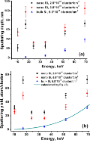 The sputtering depth and sputtering yield of the nanopowder samples do not show a simple increasing behavior (Figure 6). Significant sputtering of 33 atoms/cluster is observed even at 10.4 keV, whereas the sputtering of the bulk Si is not observed at this energy at the level of sensitivity. At 17.3 keV, unusual strong maxima are revealed and at an energy higher than 34.5 keV a continuous increase is observed. With increasing dose from 2.9 × 1015 to 5.8 × 1015 cluster/cm2, the sputtering depth does not increase linearly (Figure 6a), which is in agreement with the sublinearity of the dose dependence in Figure 3a. The sputtering yields decrease with increasing dose at all energies (Figure 6b), in agreement with the data presented in Figure 3b.