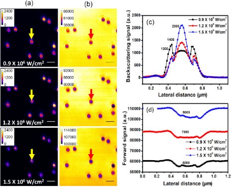 Figure 4: (a) Backward path and (b) forward path images of the same ten spherical gold nanostructures as in Figure 3 at excitation intensities above 106 W·cm−2. The x-scan signal profiles of the spherical gold nanostructure marked by arrows in (a) and (b) are given in (c) and (d), showing strong nonlinear responses of the backscattering and the attenuation signals versus the excitation intensity. The number on each peak represents the signal quantity at the center of the PSF (positive for backscattering and negative for attenuation). The scale bar is 1 µm.