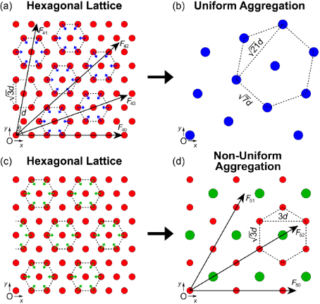(a) Two-dimensional hexagonal lattice of particles with a uniform spacing of d. A single particle centered at the origin, O, feels the net force from each infinite string of particles in all directions. Uniform aggregation occurs when all particles in the lattice combine about a center particle (blue arrows). (b) The resulting uniform aggregation from (a) leads to a new hexagonal lattice of seven-particle clusters with a uniform spacing of . (c) Particles in a hexagonal lattice undergo non-uniform aggregation when non-neighboring particle aggregates form about a center particle (green arrows). (d) The resulting non-uniform aggregation from (c) leads to a new lattice of seven-particle clusters surrounded by single particles. A single particle at the origin feels the net force from each infinite string of clusters and singlets.
