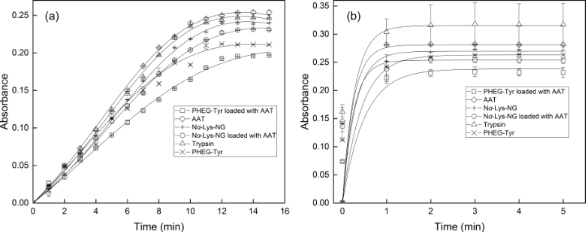 Spectrophotometric measurements of enzymatic assay of trypsin at trypsin/substrate ratio 1:50 (a) and 1:25 (b) using trypsin without inhibition (triangles), AAT (diamonds), Nα-Lys-NG nanogel loaded with AAT (circles), PHEG-Tyr nanogel loaded with AAT (squares), Nα-Lys-NG nanogel (plus signs), and PHEG-Tyr nanogel (crosses). The lines are to guide the eye.