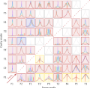 Figure 4: Map of the observed modes under anti-Stokes pumps. On the columns we have the sense mode, while the rows designate the mode it is coupled to, from bottom left. The greyed out graphs are setups where no discernible coupling is present. The red ones follow the expectation of the optomechanical Hamiltonian. The yellow ones exhibit nonlinear behaviour not described by the aforementioned Hamiltonian. Blue have a significant frequency shift, on the same order of magnitude as the linewidth of the sense mode, unexplained by cantilever expanding under heating.
