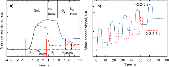 Figure 2: Time evolution of the QCM mass sensor signal during five sequential ALD cycles (a), and during one single ALD cycle (b). The labels “4-2-2-5 s” and “2-2-2-5 s” denote the pulse lengths in the sequence SnI4, N2, O3, and N2. ∆m1 and ∆m2 are the mass increments after a single ALD cycle with pulse lengths of 2-2-2-5 and 4-2-2-5 s, respectively. The mass sensor signal in arbitrary units is directly correlated to the increment in the QCM oscillation period.