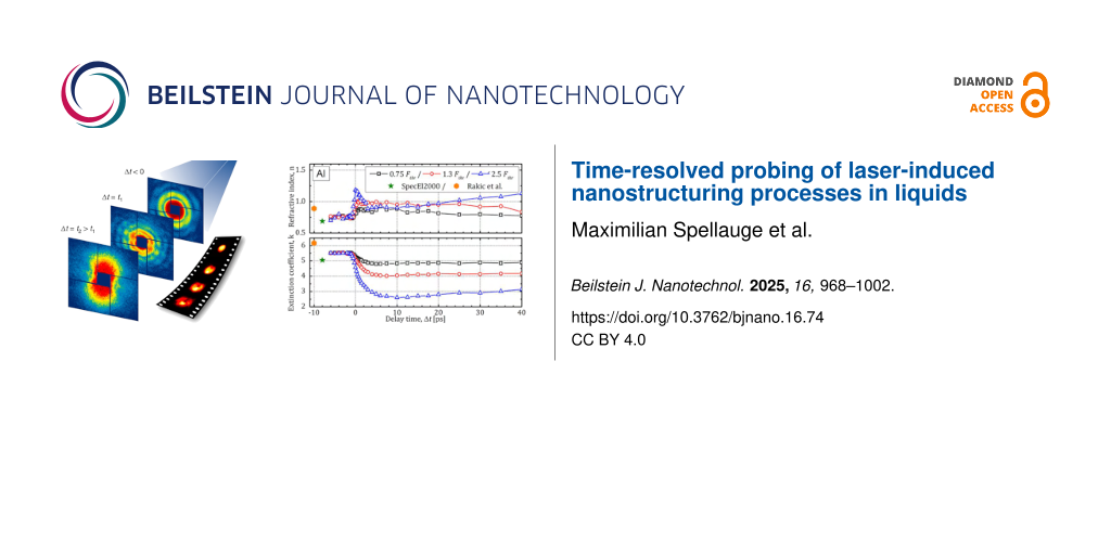 Generally, the classification of the mechanisms in LSPC identifies three main pathways that are pictured schematically in Figure 1: (i) thermal processes, where the condensed matter is heated to high lattice temperatures, leading to melting, reshaping (Figure 1B,C), evaporation, and phase explosion near the critical point (Figure 1H) [39,46-48]; (ii) stress-induced decompositions, where competition between heating and expansion leads to spallation or cavitation [36,49,50] (Figure 1I); (iii) non-thermal processes, where excessive electron emission leads to material decomposition via charge forces [51,52] (Figure 1D–G). Discriminating between these mechanisms in experiments is challenging and requires carefully designed approaches that resolve the processes spatially, temporally, and energetically.