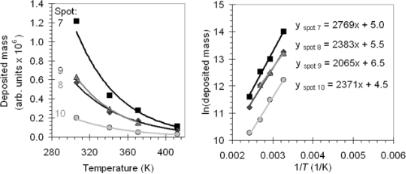 When the substrate temperature increases, the residence time of the molecules on the surface will become shorter and the desorption term in Equation 1 becomes larger. The precursor coverage, N, decreases, which leads to a lower growth rate R. In Figure 2a the same data from Figure 1b is plotted again, this time as a function of substrate temperature. The behavior described by Equation 3 is observed in Figure 1b and Figure 2a; for all beam currents the amount of deposited mass becomes smaller at higher temperatures. Based on the data in Figure 2a we made an Arrhenius plot (Figure 2b), with the natural logarithm of the average deposited mass per array as a function of 1/T. The slope of the fitted linear function is proportional to Edes/kB. The values for Edes we calculated from the data in Figure 2b vary between 17.2 kJ/mol and 23.0 kJ/mol or 0.18 eV and 0.24 eV.
