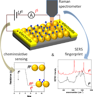 A graphical summary describing the envisaged DEOS concept is given in Figure 1. An array of noble metal colloids assembled between electrodes on a solid substrate can lead to electrical charge flow through the nanoparticle assembly by applying a voltage on the electrodes. This system can work as a resistive sensor based on the dependence of tunneling currents on the inter-NP tunnel barrier, which can be affected by the molecular species adsorbed on the NPs, or by changes of the inter-particle distance. Plasmon coupling and SERS enhancement are also known to strongly depend on inter-particle nanoscale gaps. Thus, a dense particle organization and the molecular capping layer (preventing metal particles from touching each other) control both SERS enhancement and the electrical resistance of the particle assembly. External molecular species adsorbed on the nanoparticles can modify the electrical response of the film, and can also be identified by their SERS spectrum (graphs and spectra are just for illustration). The advantages offered by such a dual sensor would be: an electrical readout, which is always preferred since it is the most simple and inexpensive method to implement in a final product/device; complementary, by optics (vibrational spectroscopy, SERS), specific information can be retrieved on the identity of the analyte. Such a DEOS would thus combine unique advantages of both electric and optical sensors.