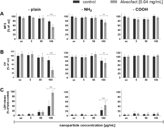 Figure 3: Comparison of cytotoxic effects on A549 after 4 h stimulation with different aSNPs (–plain, –NH2, –COOH; 5–100 µg/mL, uc: untreated control) in combination with (light grey columns) and without (dark grey columns) lung surfactant (Alveofact, 0.04 mg/mL). A: Cell viability (mitochondrial activity, MTS, % of uc); B: cell viability (crystal violet staining of nuclei, cell loss measurement, % of uc); C: LDH release (membrane integrity, % of lysis control). Data are depicted as means ± S.D. of 3 independent experiments with n = 3. For statistical analysis two-way ANOVA with Bonferroni’s post test was conducted. *P < 0.05, **P < 0.01 and ***P < 0.001 compared to the untreated control.