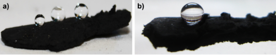 On the other hand, the CNT-sponge shows a high absorption capacity towards oils (e.g., vegetable and mineral oil). The contact angle is significantly less than 90° and therefore the CNT-sponge is lipophilic [6]. In Figure 6a the beginning of the removal of mineral oil (from AGIP company, ISO46) spreading on the water surface using the as-prepared three-dimensional material is shown. It is possible to evaluate the adsorption capacity of the sponge, from the ratio between the final and initial weight after full adsorption [6]. As an example, a CNT-sponge of 2 mg is able to selectively uptake vegetable oil up to 16 times of its initial weight. The observed high value of the uptake efficiency can be ascribed to the presence of both (i) carbon sp2 species (e.g., nanofibers), characterized by a rough surface, and (ii) the high porosity. In fact, it is known that irregular surfaces make adsorption of organics much easier than smooth ones [24]. The adsorbed oil can easily be removed after the sponge is saturated simply through squeezing it from the sponge or through burning it. In Figure 6b, the oil-saturated sponge is ignited, the fire burns the oil and the sponge is ready to be reused.