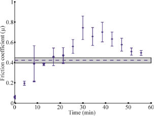 Dynamics of the friction coefficient, µ. The friction coefficient was calculated according to Equation 2 with...