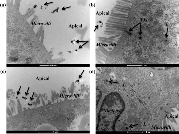After exposure to the nanoparticles as described above, Caco-2 cell monolayers grown on 3.0 μm PTFE transwell membranes were fixed with glutaraldehyde (2.5%, v/v) at room temperature for 1 h in Sorensen’s phosphate buffer, and post fixed in osmium tetroxide (1%, w/v) in de-ionised water for 1 h. The samples were rinsed in Sorensen’s phosphate buffer and dehydrated by incubation in 30%, 50%, 70%, 90% and 100% ethanol solutions. The cells were immersed in ethanol/Epon (1:1, v/v) mixture for 1 h before being transferred to pure Epon and embedded at 37 °C for 2 h. The final polymerization was carried out at 65 °C for 24 h. With a reported approach [16], ultrathin sections of 80 nm, obtained with a diamond knife using an ultramicrotome Leica U6, were mounted on copper grids, and stained with 2% uranyl acetate and 0.4% lead citrate. The sections were further examined at 120 kV with an FEI TECNAI transmission electron microscope.