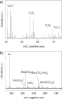 Figure 9: a) Positive ion mass spectrum m/z 40–75 and b) negative ion mass spectrum m/z 190–290 of the deposi...