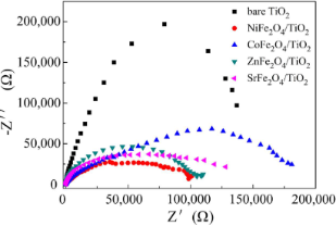 Figure 6: Comparison of arc radius of Nyquist plot between bare TiO2 and modified TiO2 (MFe2O4/ TiO2) samples (M = Ni2+, Co2+, Zn2+, Sr2+). Reprinted from [97], an article distributed under the Creative Commons Attribution 4.0 license, http://creativecommons.org/licenses/by/4.0/, copyright the authors of [97].