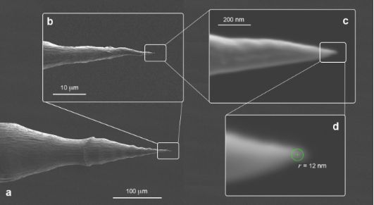 Scanning electron microscopy (SEM) inspection of the produced tips is carried out to characterize the tip apex using a Zeiss Merlin field emission electron microscope, equipped with a Gemini II column.