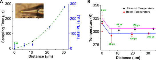 Figure 7: (A) Plot of sampling time and total photoluminescence intensity of UCNPs versus distance from the tip of a Taylor cone (xtip = 0). Both sampling time and intensity follow an r2-dependence along the jet where r is the radius of the cross section perpendicular to x. Distance x and radius r are related by r = x tanθ where θ is the Taylor cone angle. The sampling time reduces to 2 μs at the tip. (B) A plot of temperature calculated along the trajectory of a Taylor cone at room temperature (296 K) and at elevated temperature (306 K). The sampling time at a given distance is indicated in the figure.
