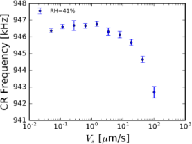 A sample of high-grade mica was mounted to a steel puck using cyanoacrylate. A razor blade was then used to cleave the sample, leaving behind a pristine sample surface. The sample was placed in a closed AFM flow-cell with an integrated relative humidity sensor. A cantilever with spring constant kL = 1.7 ± 0.2 N/m and first free resonance = 61.85 ± 0.1 kHz was mounted to a custom cantilever holder with an integrated highly-damped piezo actuator. The cantilever was chosen to maximize force control while still maintaining resolvable frequency sensitivity. Additionally, the frequency bandwidth of the AFM (2 MHz) and the drive and detection sensitivity of the third eigenmode placed further constraints on the selection of the cantilever. A gas mixing apparatus was used to mix streams of dry and saturated N2 to achieve various levels of relative humidity in the cell. The cantilever was brought into contact with the sample at 100 nN and 300 nN. The NIST SPRITE circuit [23] was used to drive the cantilever-holder actuator and to excite and track the first and second CR frequencies while the scan velocity was randomly varied between 0.05 and 100 μm/s. The experiments were repeated on a sample of highly oriented pyrolytic graphite (HOPG).