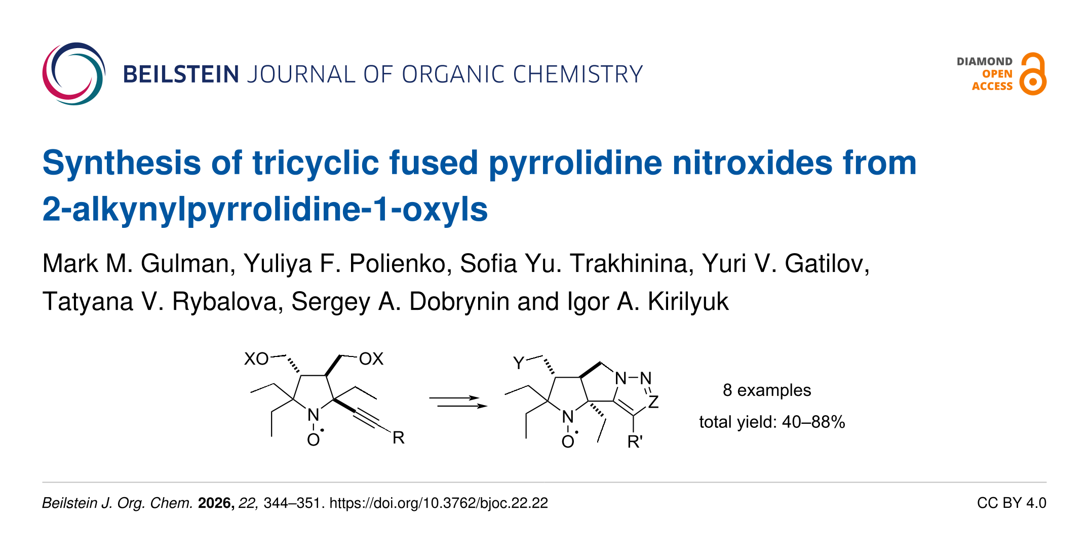 Gulman, M. M.; Polienko, Y. F.; Trakhininа, S. Y.; Gatilov, Y. V.; Rybalova, T. V.; Dobrynin, S. A.; Kirilyuk, I. A. Beilstein J. Org. Chem. 2026, 22, 344–351. doi:10.3762/bjoc.22.22
